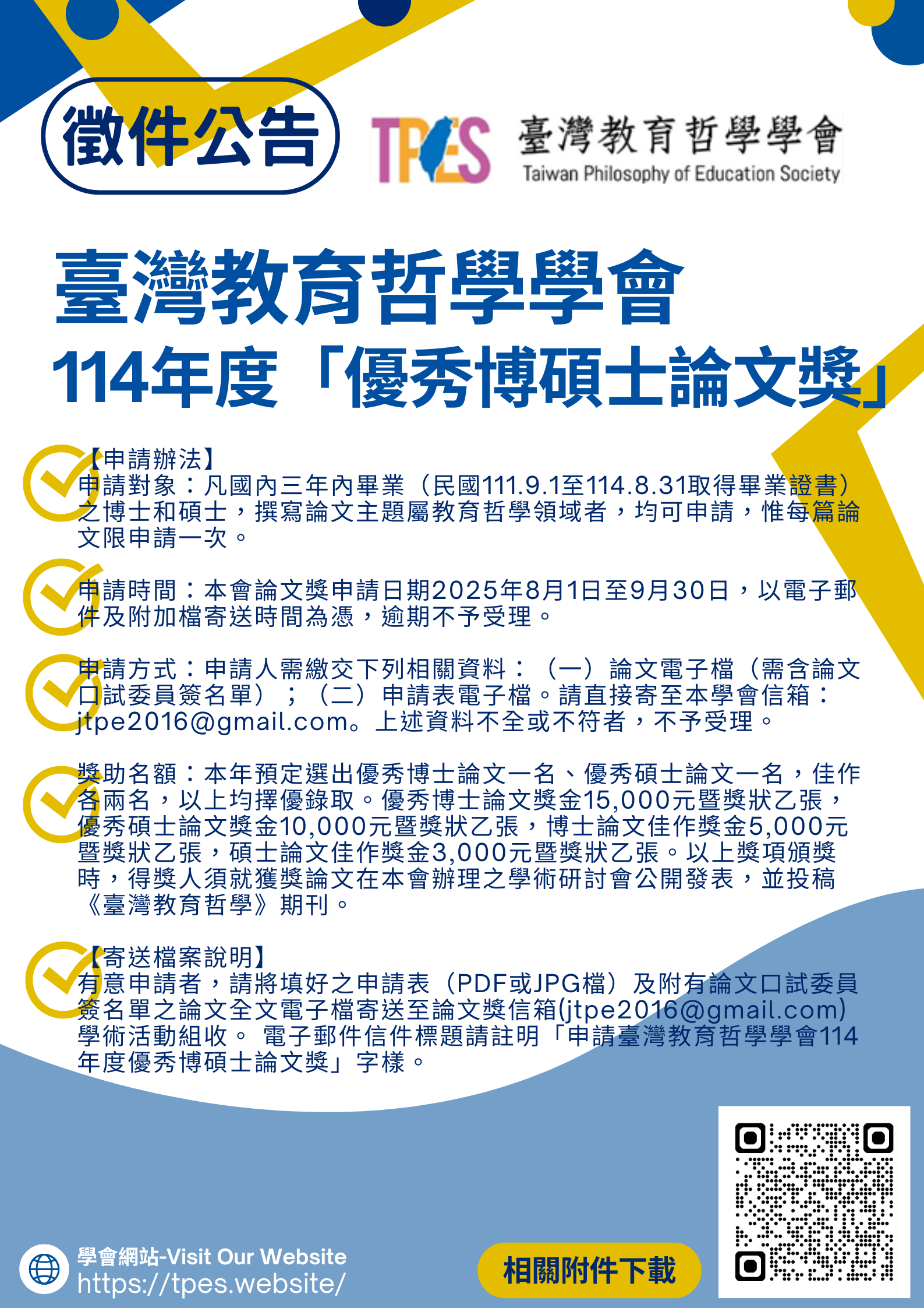 臺灣教育哲學學會114年度「優秀博碩士論文獎」徵件公告