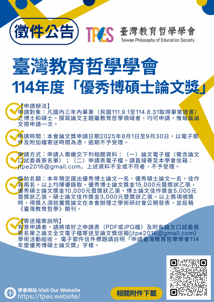 各位熱愛教育哲學的先進與新進大家好!本年度學會將進行「優秀博碩士論文獎」徵選,如您門下學生或您取得學位時間與學位論文性質正符合我們的申請範圍,還請不吝向學會申請參與論文獎!詳情請見下方,如有關於論文獎的疑問,歡迎來信jtpe2016@gmail.com詢問: