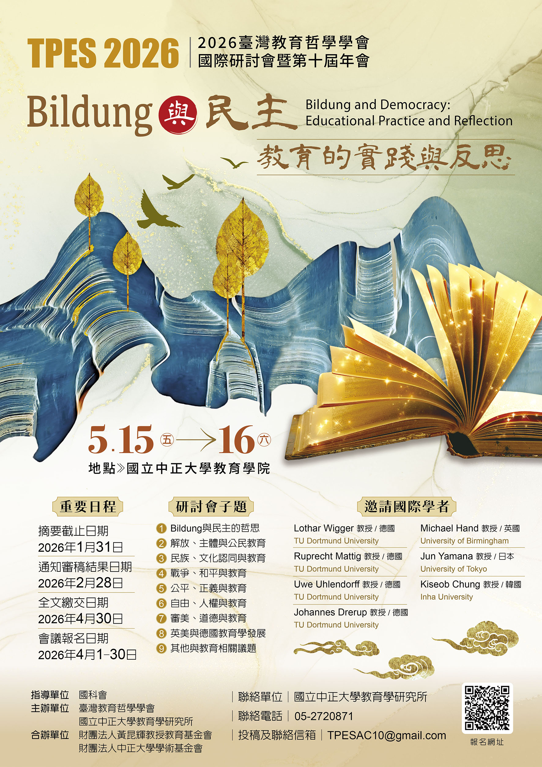 明年(2026)將迎來我們教育哲學學會的十周年年會盛事,此次年會感謝國立中正大學教育學研究所承辦,因此我們將於2026年5月15日(五) 及 2026年5月16日(六)兩天,假國立中正大學教育學院二館(嘉義縣民雄鄉大學路168號)舉辦!